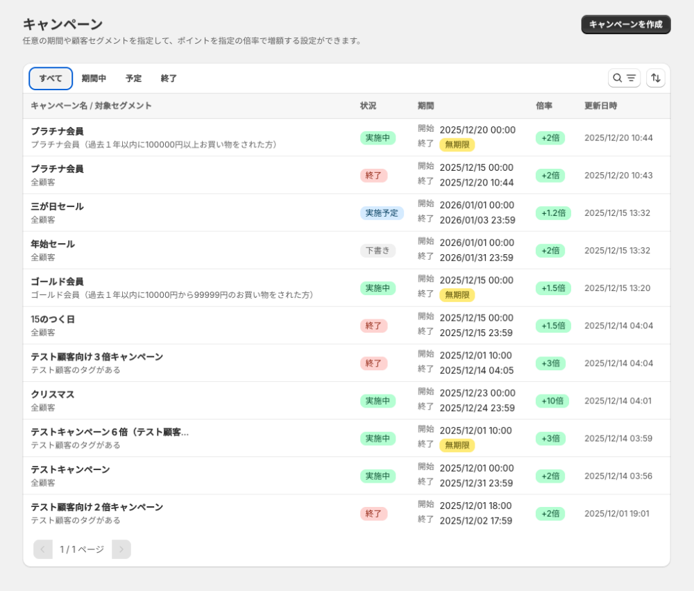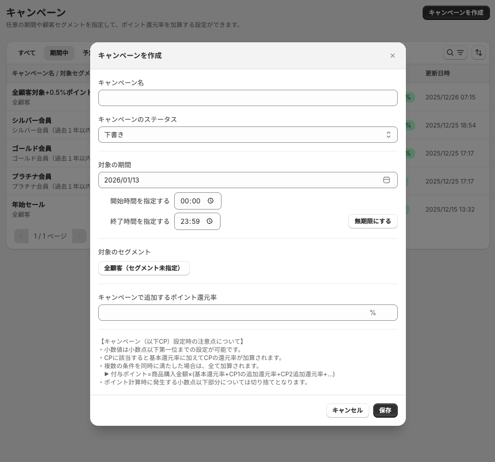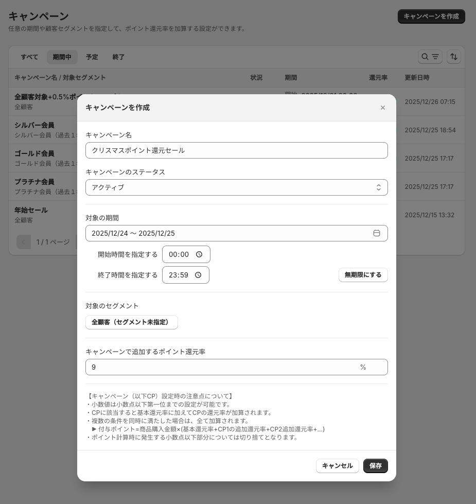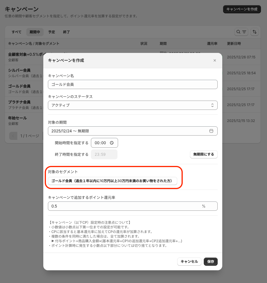 2025/1/14のアップデートより詳細なキャンペーン機能を使用して、特定の条件下でポイント付与倍率を変更することができるようになります。これまでの期間を指定した追加付与に加え、顧客セグメントを指定しておき、条件を満たした場合にのみポイントを追加付与することも可能となります。