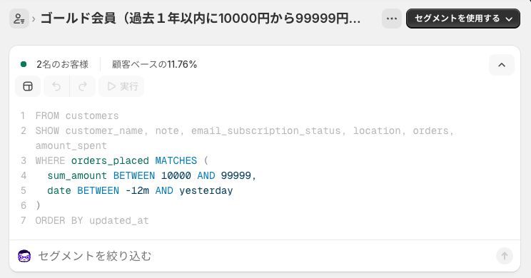 設定クエリ:orders_placed MATCHES (sum_amount BETWEEN 10000 AND 99999,date BETWEEN -12m AND yesterday)