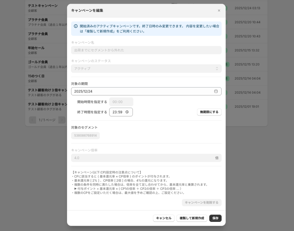 一度実施されたキャンペーンは削除したり、終了日時以外の編集をすることができません。