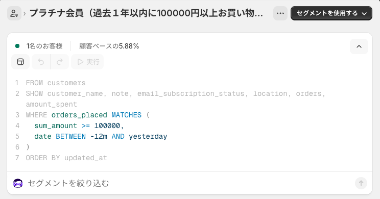 設定クエリ:orders_placed MATCHES (sum_amount >= 100000,date BETWEEN -12m AND yesterday)