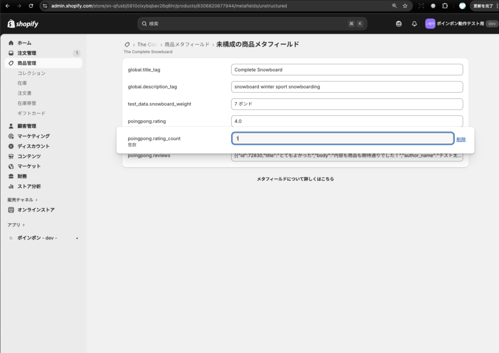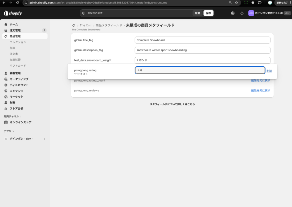 レビューの平均点内容を示す「poingpong.rating」を探し、入力欄をクリックして「削除」を選択します
