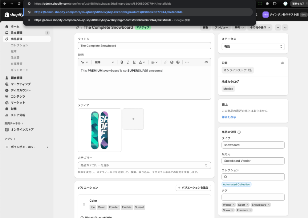 商品ページにメタフィールドの項目がない場合はブラウザのアドレスバー(ページのURL)の最後に「/metafields」を付け加えて「/products/数字の羅列(商品ID)/metafields」となるように変更してEnterを押してください。