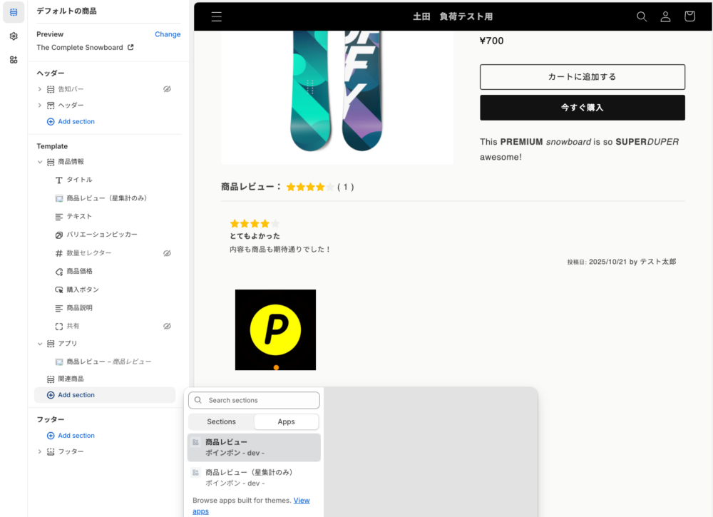 左メニュー内の「Add section」または「セクションを追加」を選択して表示されたウィンドウの上部にある「Apps」を選択し、「商品レビュー ポインポン」を選択してください。