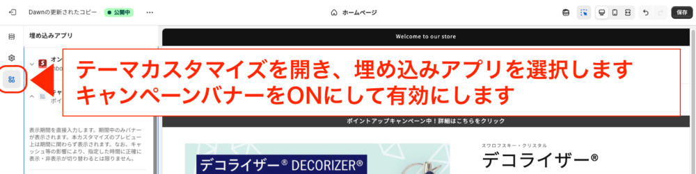 「テーマカスタマイズ」を開き、左のアイコン列から「埋め込みアプリ」から「キャンペーンバナー」をONにします。